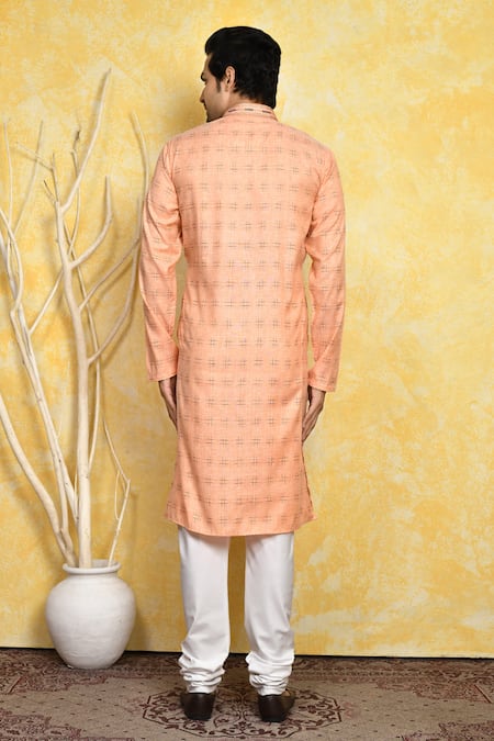 Orange kurta featuring full sleeves, a mandarin collar, and a hashtag print with stitchline thread embroidery. Paired with a white churidar featuring an elasticated waistband.