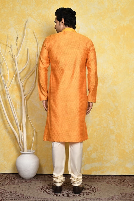 Orange kurta featuring full sleeves with resham woven motifs in a Mughal pattern. Paired with a cream churidar with an elasticated waistband.