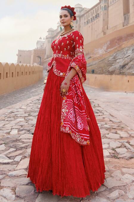 Red fusion lehenga set featuring a vintage peplum blouse and a dupatta. The blouse and lehenga are made of pure silk, while the dupatta is crafted from pure Bandhani Gajiji silk.