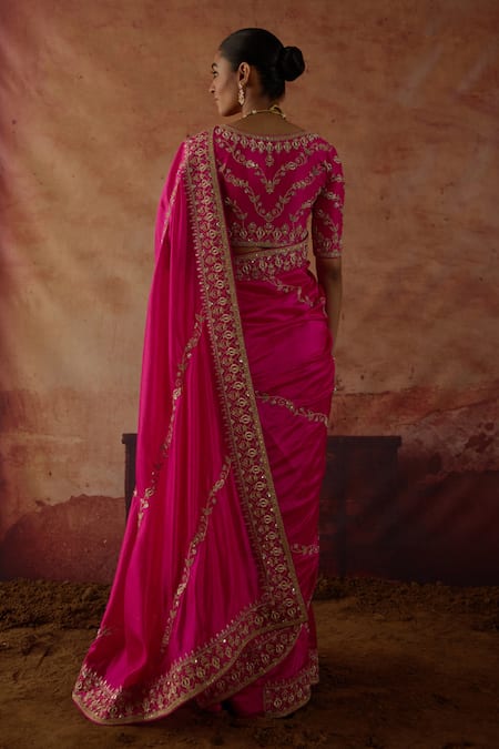 Pink Silk Embroidery, Zari, Metallic Thread V-neck Gulaban Saree With Blouse