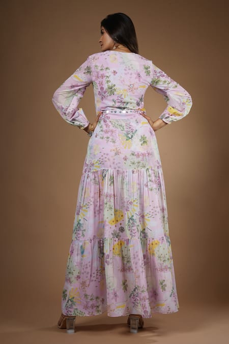 Purple padded kurta featuring vintage botanical prints and sequin embellishments. Paired with coordinating sequin embellished parallel pant.