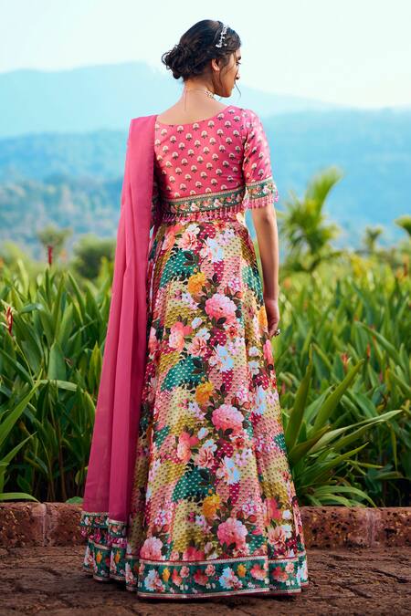 Buy_Lashkaraa_Pink Silk Crystals V-neck Vintage Floral Print Lehenga Set_Online_at_Aza_Fashions