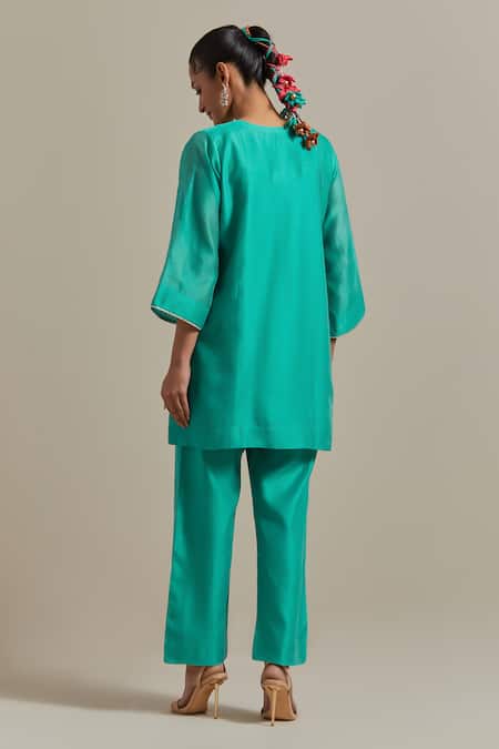 Aqua blue kurta featuring floral motif embroidery on the neckline and lace detailing on the sleeves. Paired with a solid pant for a complete look.