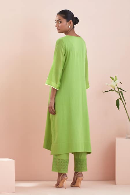 Green kurta featuring notched neckline and floral lace sleeve embroidery. Paired with coordinating straight pant with lace detailing at the hem.