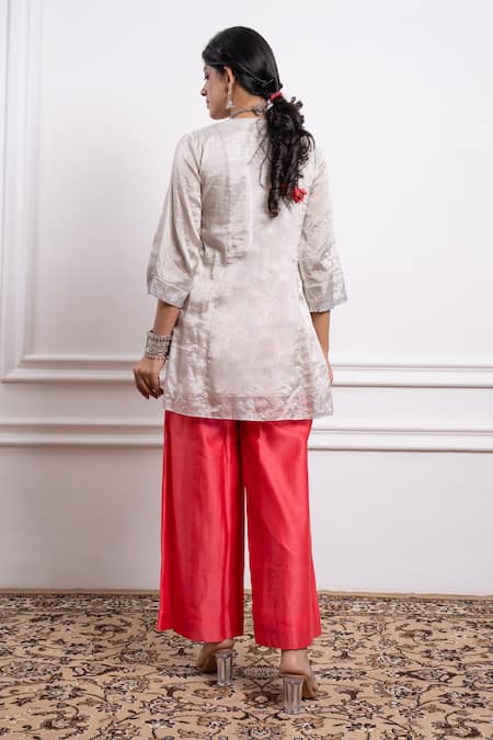 Pink Chanderi, Handloom Floral Zardosi Embroidered Short Angarkha And Palazzo Set