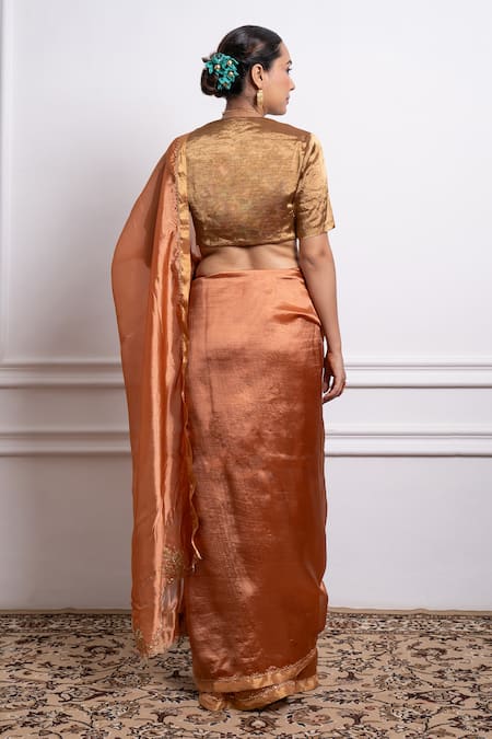 Saffron brown handwoven pattu silk saree featuring floral zari and sequin embroidered border detailing. Comes along with an unstitched running blouse piece.