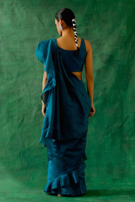 Teal blue handwoven chanderi saree featuring ruffled border detailing. Paired with a coordinating sleeveless blouse and zari embroidered belt.