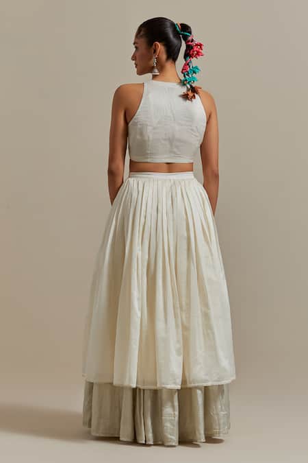 Multi Color Chanderi, Silk Embroidery, Handwoven Layered Lehenga Blouse Set