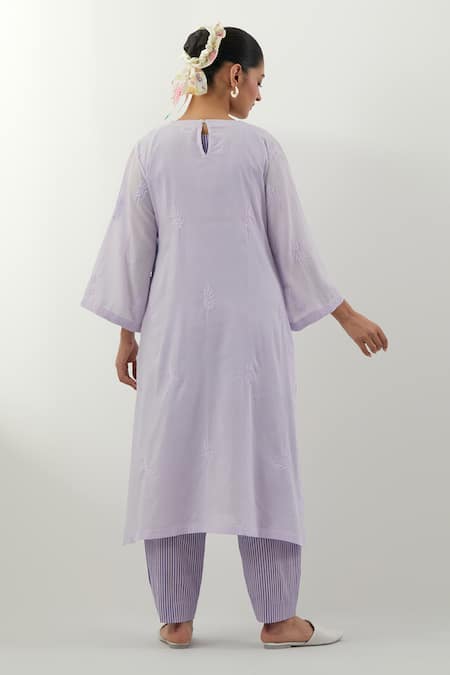 Lavender kurta featuring Phool Patti Chikankari embroidery. Paired with striped pant and a separate inner slip.