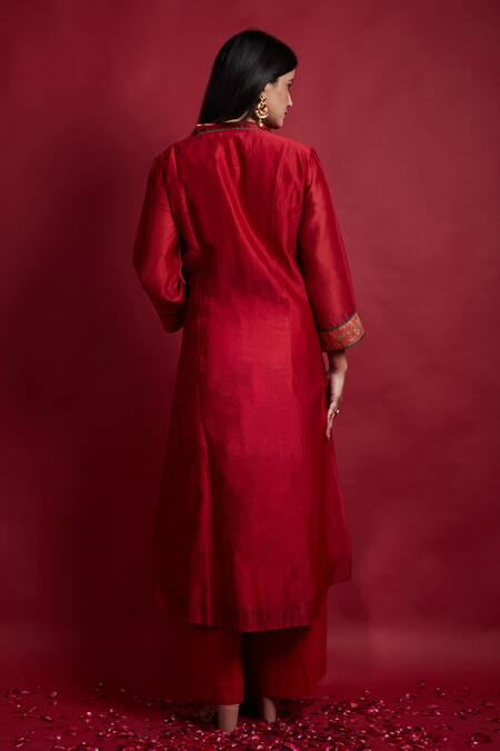 Red A-line kalidar kurta made from pure handwoven Chanderi fabric. Paired with a matching loose cotton palazzo.