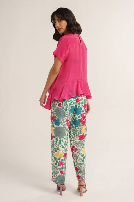 Pink asymmetric hem top featuring a cinched front and sequin highlights. Paired with floral print pants in a white base with multi-color accents.