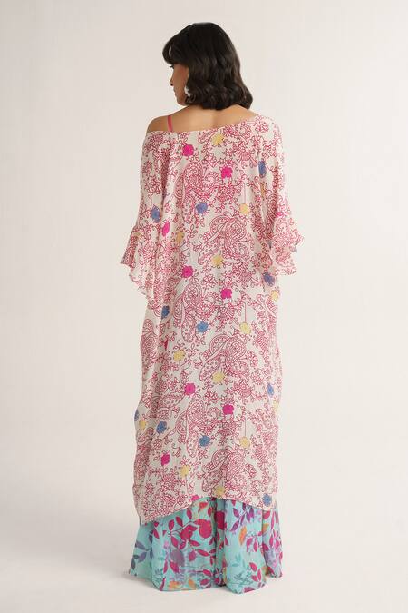 Multi color floral print cape featuring three quarter sleeves and a front open design. Paired with a padded pink blouse adorned with sequins and a blue tone pant with floral prints.