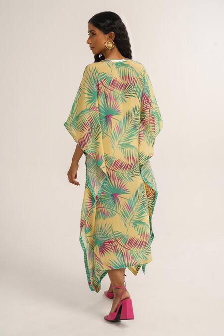 Yellow kaftan featuring all-over multi-color tropical prints and placement sequin highlights