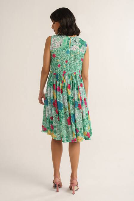 Green dress featuring a round neck and sleeveless design with pleated flare