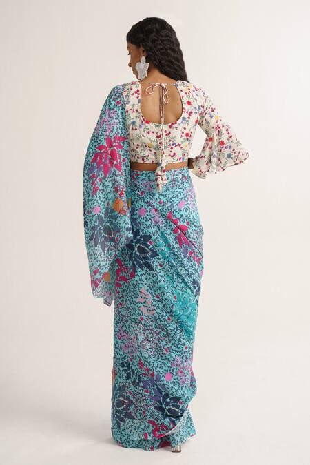 Blue pre-stitched saree featuring all over contrast floral prints and sequin highlights. Paired with a white base padded blouse adorned with floral prints and circular flounce sleeves.