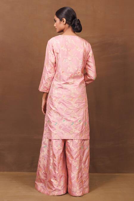 Pink Silk Embroidery Round Neck Banarasi Flower Vine Pattern Kurta Sharara Set