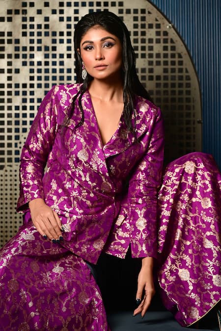 Purple blazer featuring a handwoven floral pattern with lapel collar and full sleeves. Paired with a coordinating handwoven sharara.