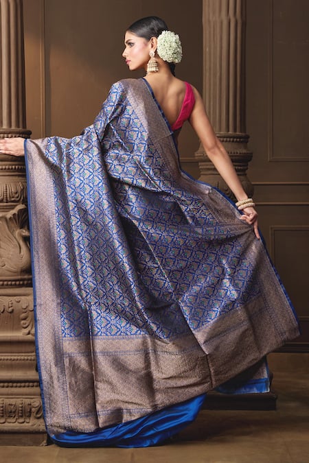 A blue pure handwoven Banarsi silk saree featuring brocade meenakari woven patterns.