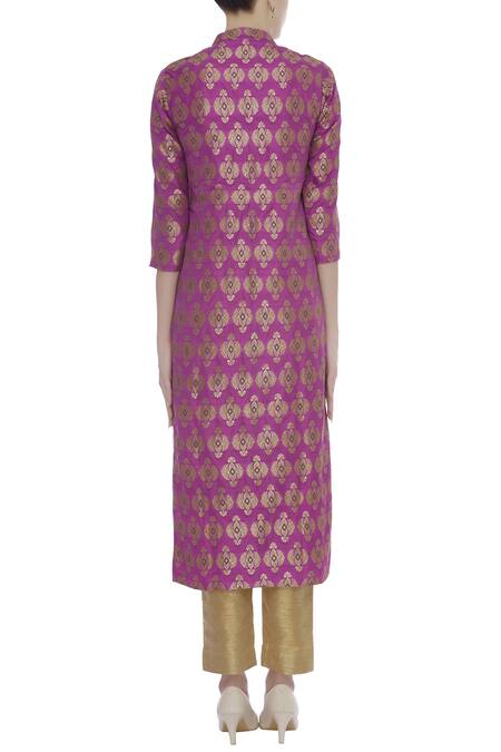 A semi-formal look, this purple brocade silk tunic is enhanced with motifs with front high slits.