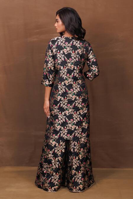 Black Silk Beads Keyhole Neck Floral Jaal Pattern Kurta Sharara Set