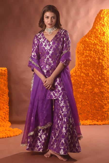 Purple kurta in banarasi silk featuring a floral pattern and V neckline. Paired with a matching sharara and dupatta.