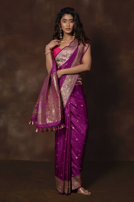 Purple Silk Zari Geometric Woven Saree With Running Blouse