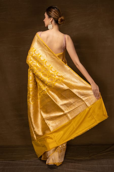 Yellow Silk Mughal Pattern Banarasi Handwoven Saree With Running Blouse