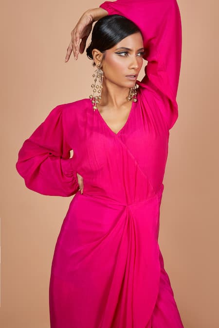 Hot pink asymmetric draped dress featuring a V-neckline and full sleeves