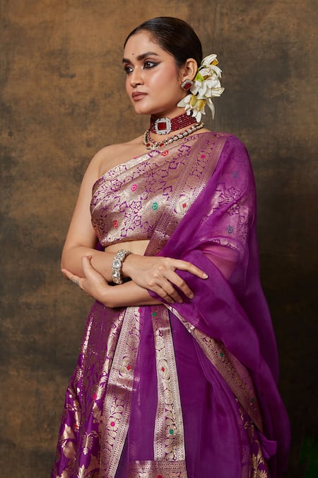 Purple Silk, Chiffon Woven Floral Vine Lehenga Set With Unstitched Blouse Piece