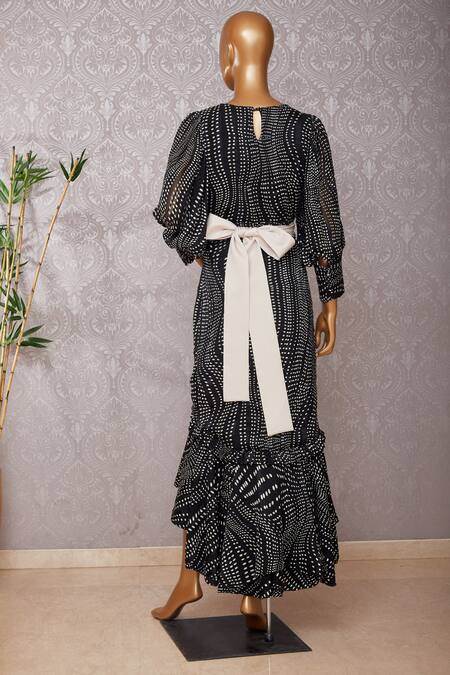 Black midi dress with all over polka dot print & high-low hemline. Comes with belt.