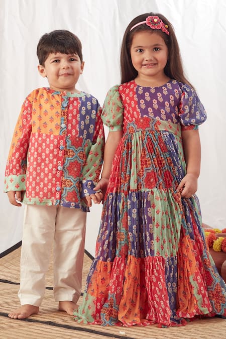 Multi-panel block print design, Comfort fit for ease of movement, Puff sleeves for a playful look