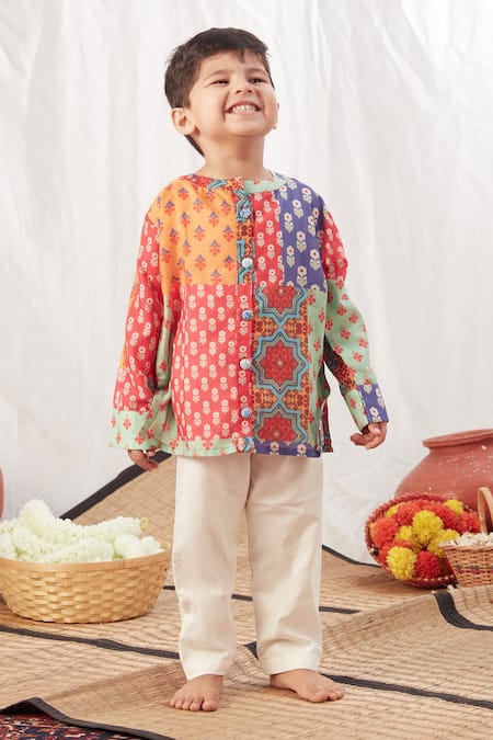 Multi color cotton kurta featuring floral and geometric block print with a round collar. Paired with straight pants for a complete look.