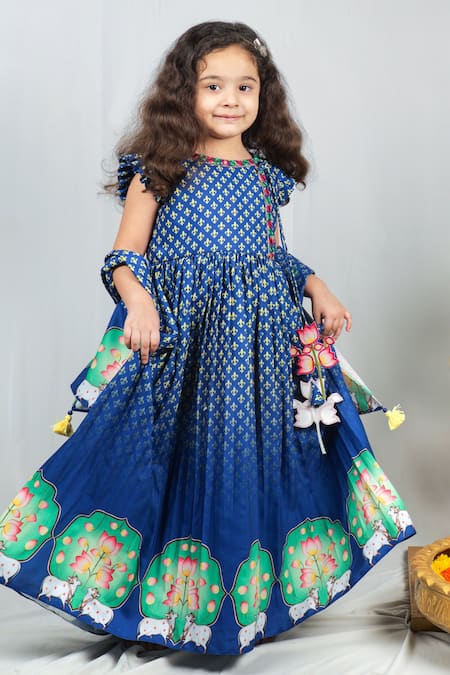 Blue angarkha featuring all-over fleur de lis, lotus, and cow pattern pichwai print with frill sleeves and mirror embroidered borders. Paired with a printed tassel edge bordered dupatta.