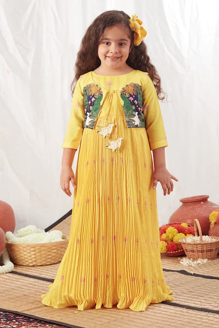 Buy_Vivedkids_Yellow Crepe, Cotton Tassels, Embroidery Pleated Dress With Jacket _at_Aza_Fashions