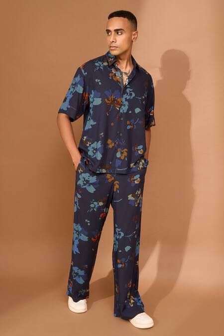 Navy blue boxy oversized shirt featuring a floral print and contrast color block sleeves. Paired with matching Korean style pants for a coordinated look.