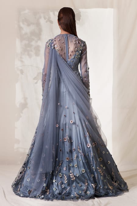 Stone blue lehenga style flared saree gown with floral 3D applique embroidered motifs, pintucks detail, sheer sleeves & drape detail.