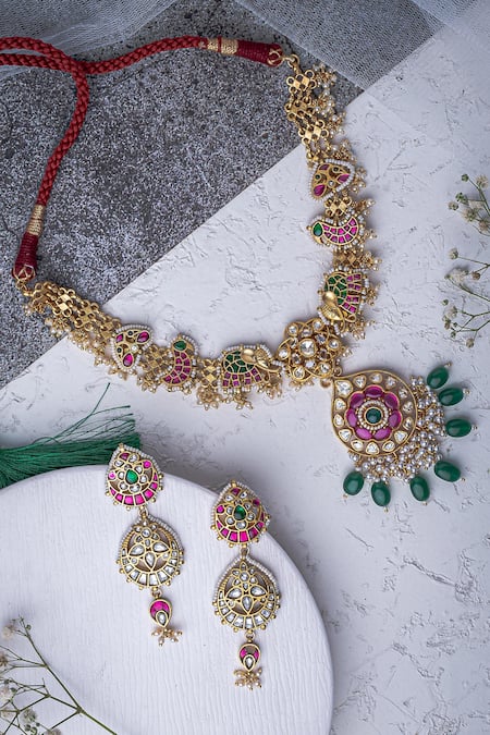 Gold and multi-colored jewellery set featuring a necklace with dori closure and a pair of earrings with push back closure. Embellished with kundan and polki stones, crafted from mix metal, and designed to be nickel and lead free for safe wear.