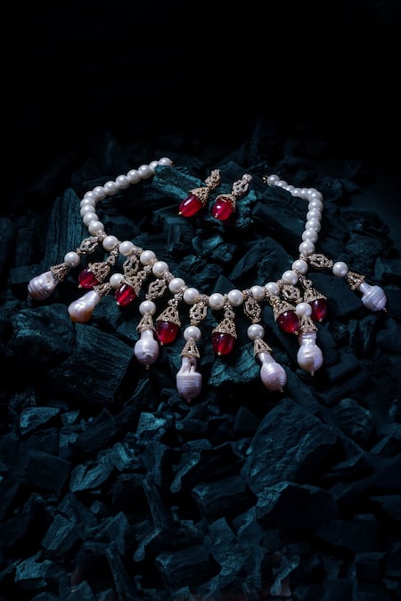 Silver jewelry set featuring a necklace with pearl and red stone embellishments. Includes a pair of matching earrings with similar design elements.