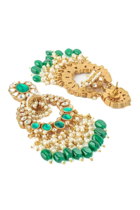 Chandbali design with central jhumka detail, Alternating kundan and green polki stones, Multiple strands of pearls and green beads