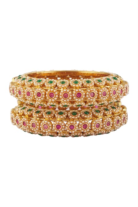 Multi Color Pearls, Stones Floral Butti Kundan Embellished Bangles- Set Of 2