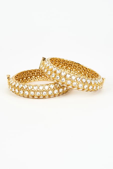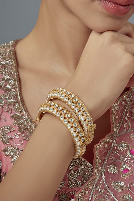 Gold plated bangles featuring intricate kundan and polki embellishments. This set includes two bangles designed for a traditional aesthetic.