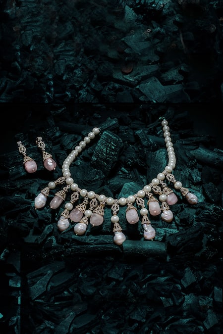 Gold and pink jewelry set featuring a necklace and a pair of earrings. The necklace has pearl embellishments and a hook with chain closure, while the earrings have a push back closure.