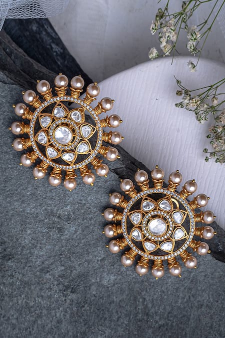 Gold stud earrings featuring pearl embellishments and Kundan stones