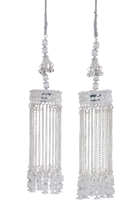 Hanging charm with bead and ghungroo drops, Rhodium plated finish, Intricate chain detailing