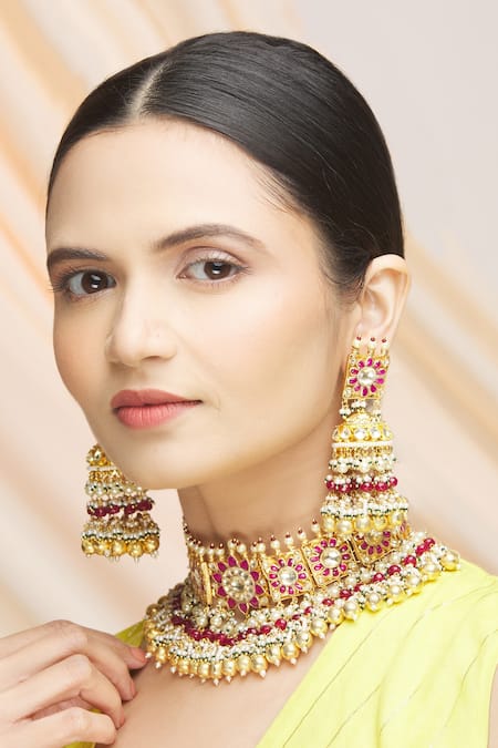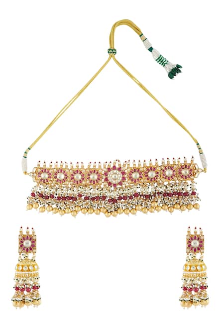 Gold choker set featuring intricate Kundan work with red stones and pearl drops. Accompanied by matching jhumka earrings with similar embellishments.