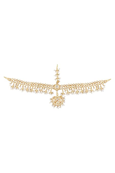 Gold mathapatti featuring a crescent moon motif encrusted with kundan and a pearl rim