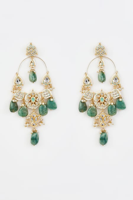 Gold plated dangler earrings featuring green kundan and polki embellishments with bead drops