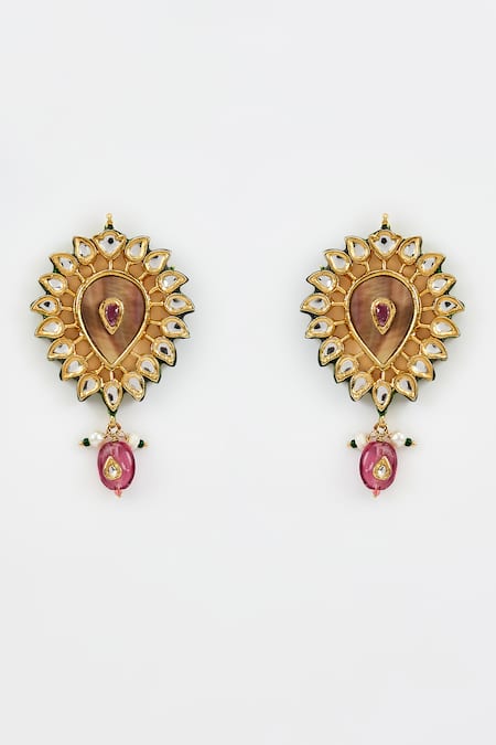 Gold plated drop earrings featuring pink gemstone, kundan, and polki embellishments
