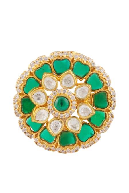 Green Smocking, Diamonds Kundan Polki Embellished Ring