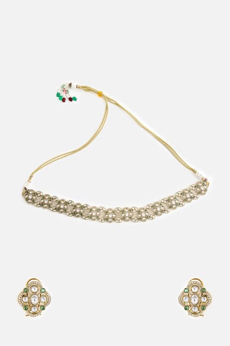 A green brass choker necklace featuring floral motifs embellished with Kundan, Polki, and pearls. It is paired with coordinating floral stud earrings.